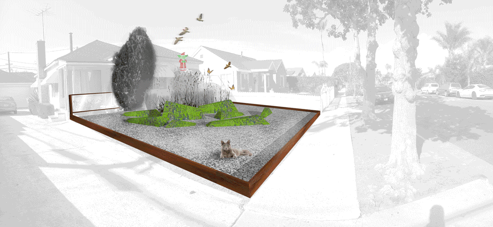 These objects will be carefully designed and constructed of papercrete or hypertufa, which are both intentionally temporary and ecologically performative. The gators will absorb water and provide holes, crannies, and niches for seeds and spores to attach to and express themselves. This process will take some time, and will be aided by the natural seed dispersal, animals and human foot traffic. Botanical stragglers from adjacent yards, common weeds of los angeles, mosses, wildflowers, and others.