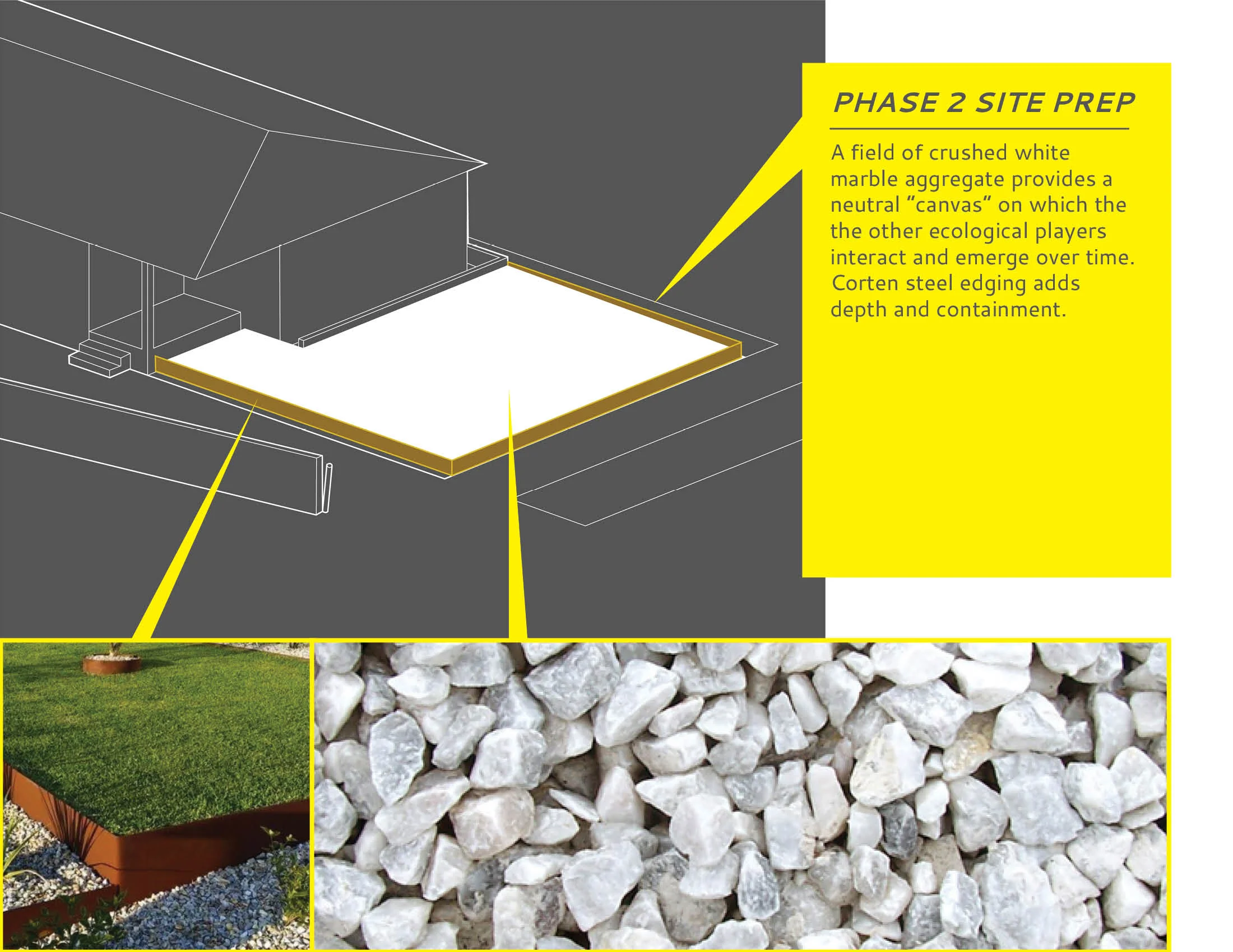 But what about the plants? We’re glad you asked. Rather than plant anything intentionally, our approach to plant growth in the landscape is to attract and nurture spontaneously emerging plant communities that don’t require water and maintenance to establish themselves and thrive. We hope to attract these plants with the addition of a field of objects we call “gators” (short for “ecological instigators”) which add visual, textual and ecological variation and disturbance into the ecosystem of the yard.